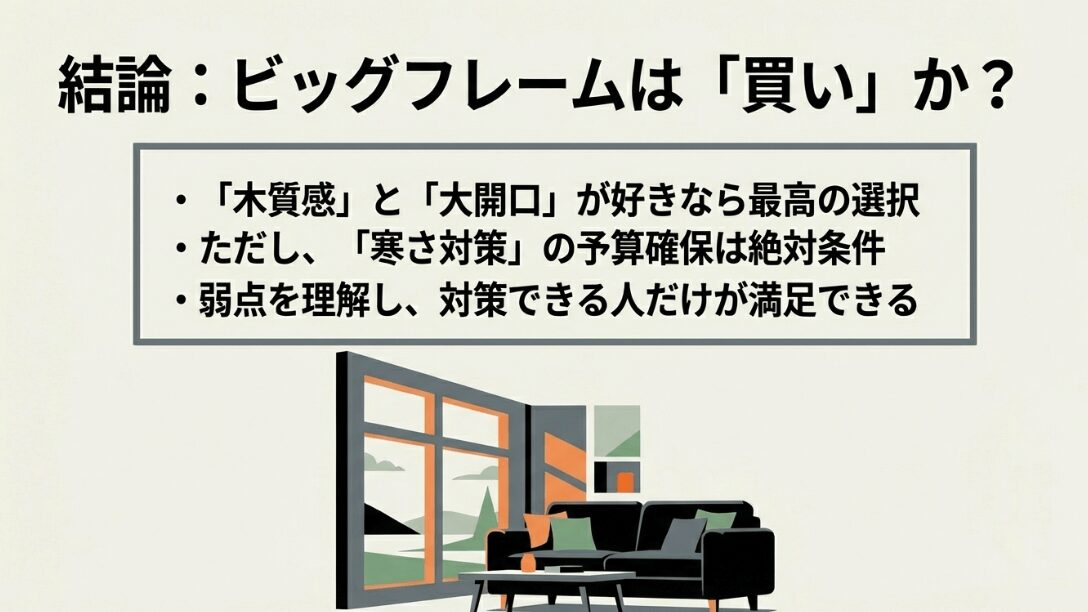 木質感と大開口を愛し、寒さ対策の予算を確保できる人にとってBF構法が最高の選択肢であることを示すイメージ画像。