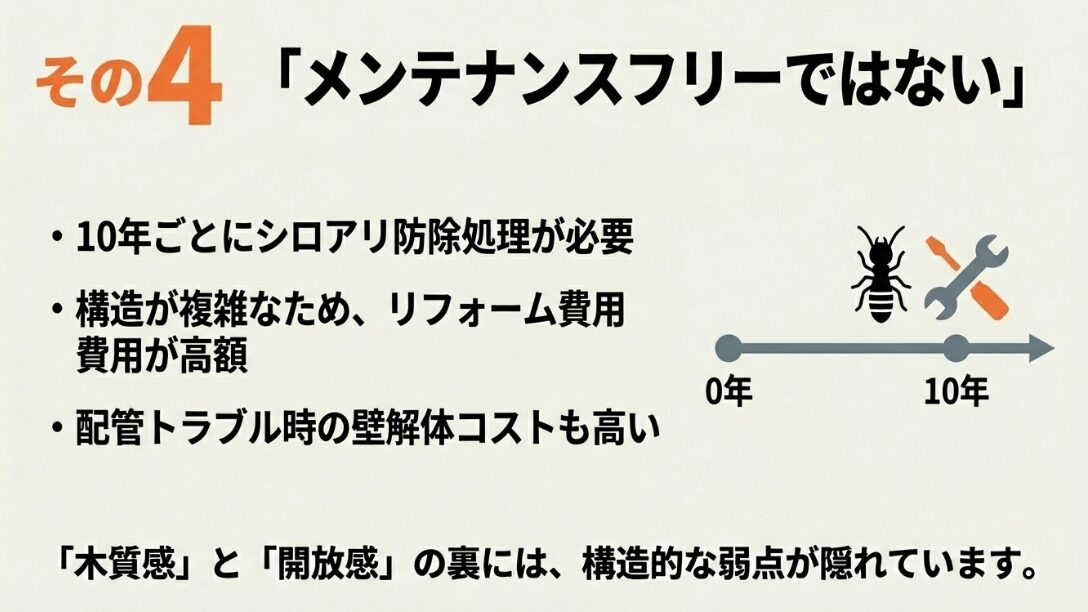 10年ごとのシロアリ防除処理や、構造の複雑さによるリフォーム費用の高騰、配管トラブル時のコストリスクを示す図解。