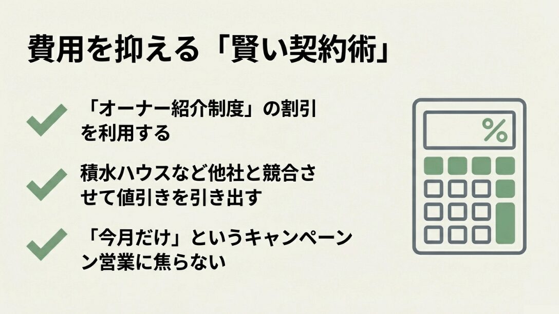 オーナー紹介制度の利用や、他社競合による値引き交渉、キャンペーン営業に焦らない姿勢を推奨する図解。