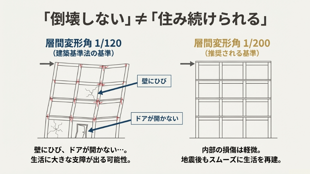 層間変形角1/120(建築基準法)と1/200(推奨基準)における、壁のひび割れやドア開閉不全のリスク比較図