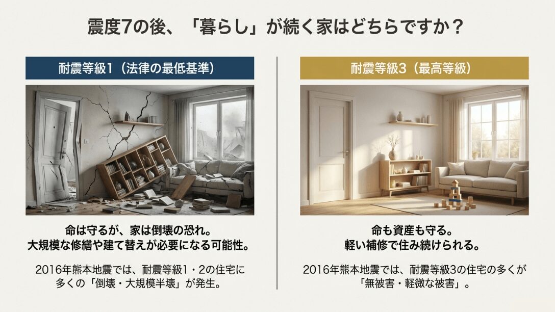 「命が助かれば良い(等級1)」と考えるか、「地震の後もそのまま自宅で生活したい(等級3)」と考えるか。避難所生活のストレスや二重ローンのリスクを回避するためにも、個人的には等級3が実質的なスタンダードであると考えています。