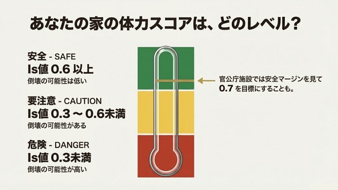 倒壊・崩壊する危険性が低いと判定されます。震度6強から7程度の地震に対しても、人命にかかわる被害は生じにくいレベルです。マンションやオフィスビルではこの「0.6」が耐震改修促進法における安全のボーダーラインとなっています。