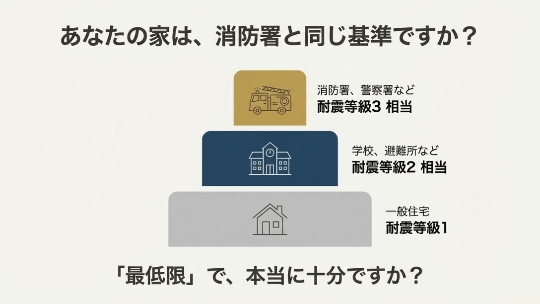消防署(耐震等級3相当)、学校(耐震等級2相当)、一般住宅(耐震等級1)の耐震基準の違いを示す比較イラスト