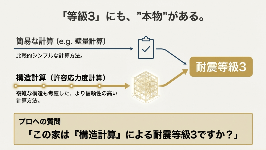 ここで一つ、注意喚起しておきたいポイントがあります。それは、同じ「耐震等級3」でもその計算方法によって信頼性が異なるという点です。