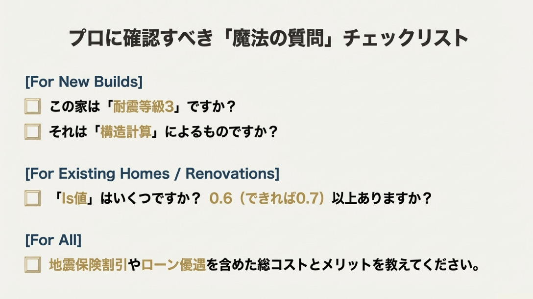 新築・中古物件・リノベーションの各シーンで、建築のプロに確認すべき耐震等級やIs値に関する質問リスト