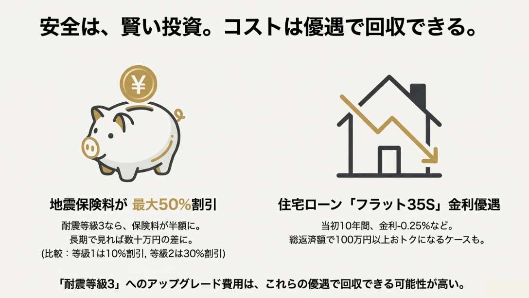 耐震等級3にすることで得られる地震保険料50%割引やフラット35Sの金利優遇など、経済的な投資回収メリットを示す図
